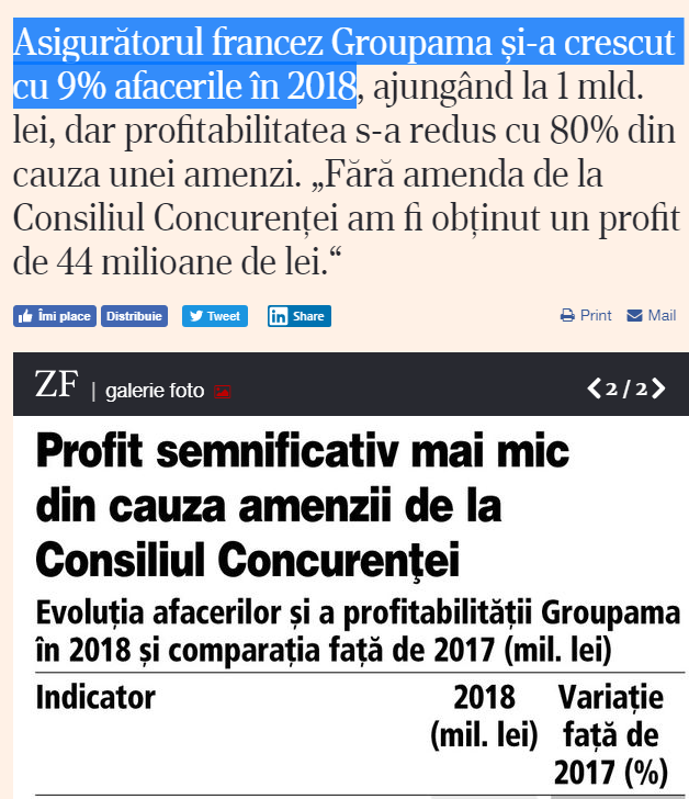 Groupama, sucursala locală a asigurătorului francez cu acelaşi nume, a închis anul 2018 cu prime brute subscrise în valoare de un miliard de lei, în creştere cu aproape 9% faţă de 2018, dar cu un profit de numai 9 milioane de lei. Profitabilitatea asigurătorului a fost influenţată negativ de amenda Consi¬liului Concurenţei, în valoare de […]